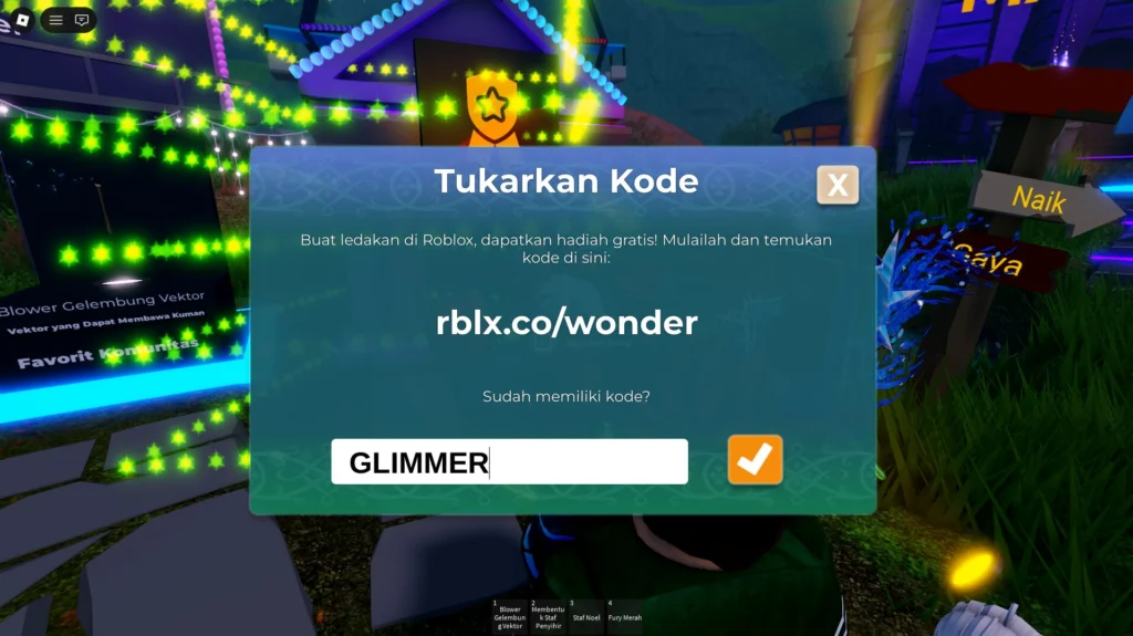 Setelah berada di area tersebut, dekati NPC atau titik interaksi sampai muncul tombol untuk membuka menu hadiah. Pada beberapa perangkat biasanya akan muncul tombol E atau tulisan untuk mendapatkan hadiah. Tekan tombol itu agar kotak penukaran kode terbuka.